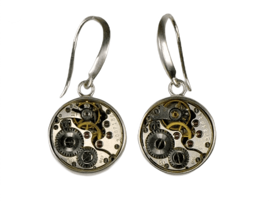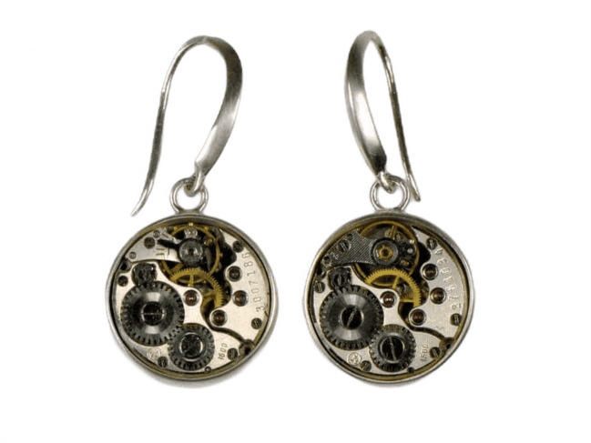 The ‘Machinarium Collection’ is a steampunk-inspired fine jewelry collection designed and created by Decimononic. Most of its pieces are made with sterling silver and have non-functional vintage or antique watch movements and/or gemstones.