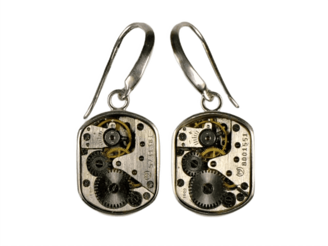 The ‘Machinarium Collection’ is a steampunk-inspired fine jewelry collection designed and created by Decimononic. Most of its pieces are made with sterling silver and have non-functional vintage or antique watch movements and/or gemstones.