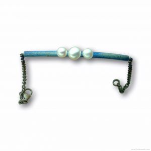 Handmade blue-colored titanium bar cuff with titanium chain, lobster clasp and one freshwater cultured pearl.