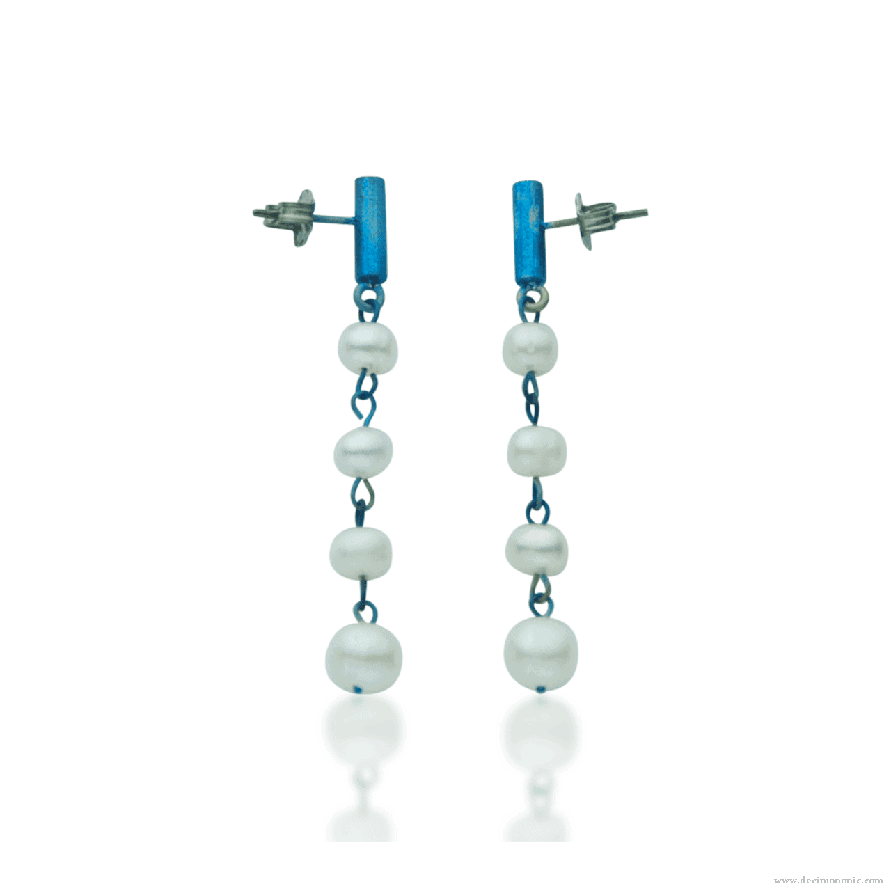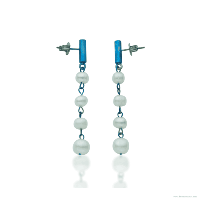Handmade blue-colored titanium short bar post earrings with freshwater cultured pearls string and titanium ear nuts.