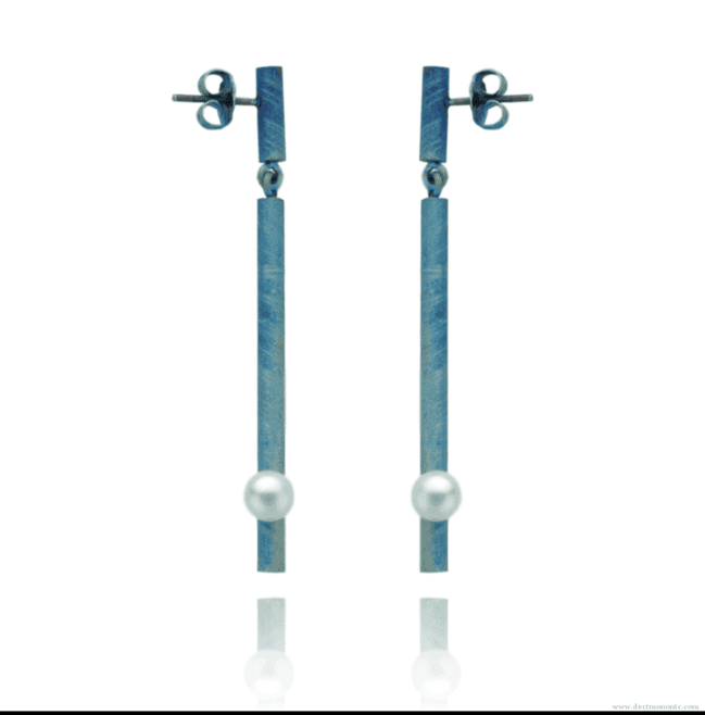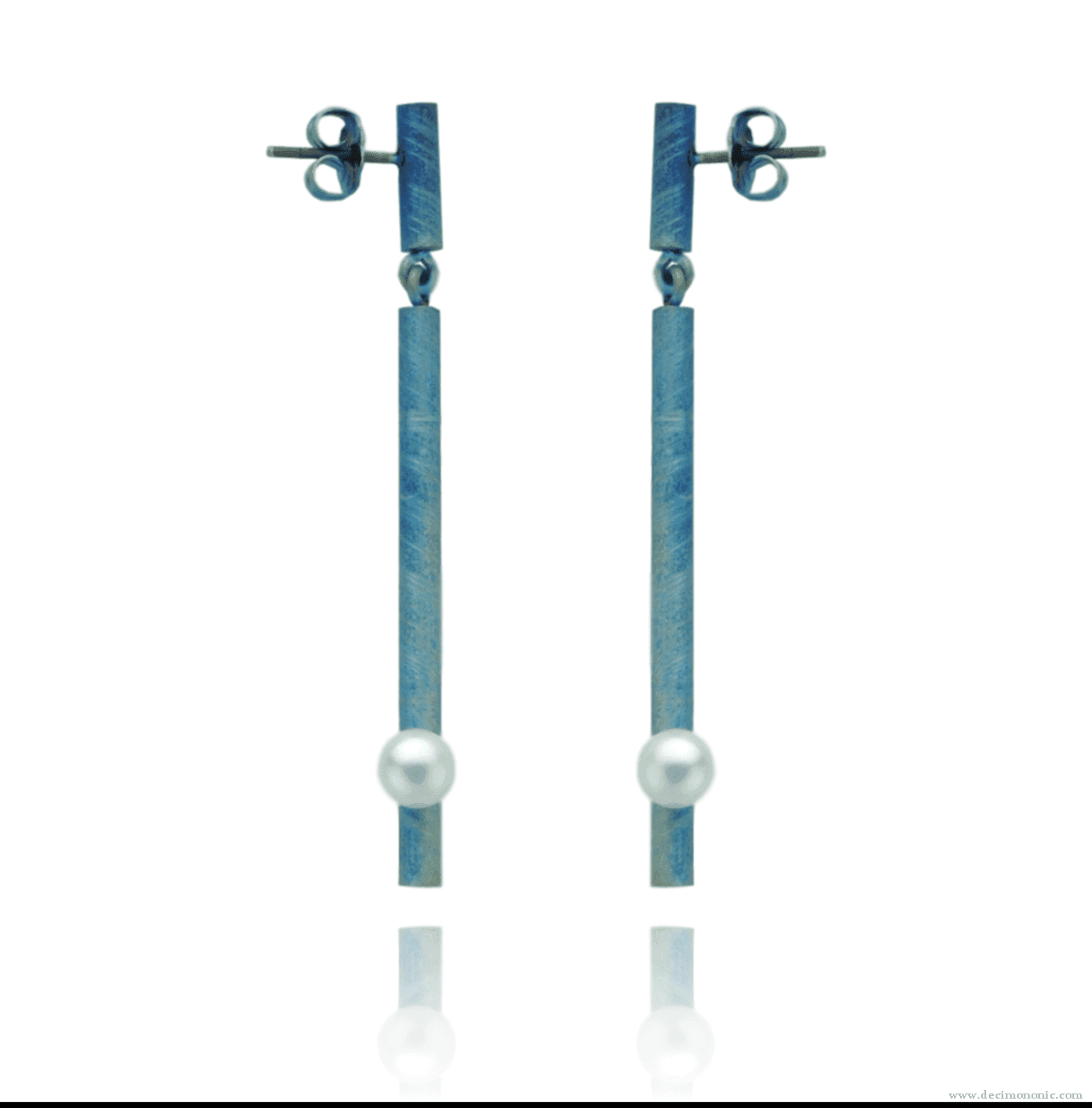 Handmade blue-colored titanium long bar earrings, freshwater cultured pearl and titanium ear nuts.