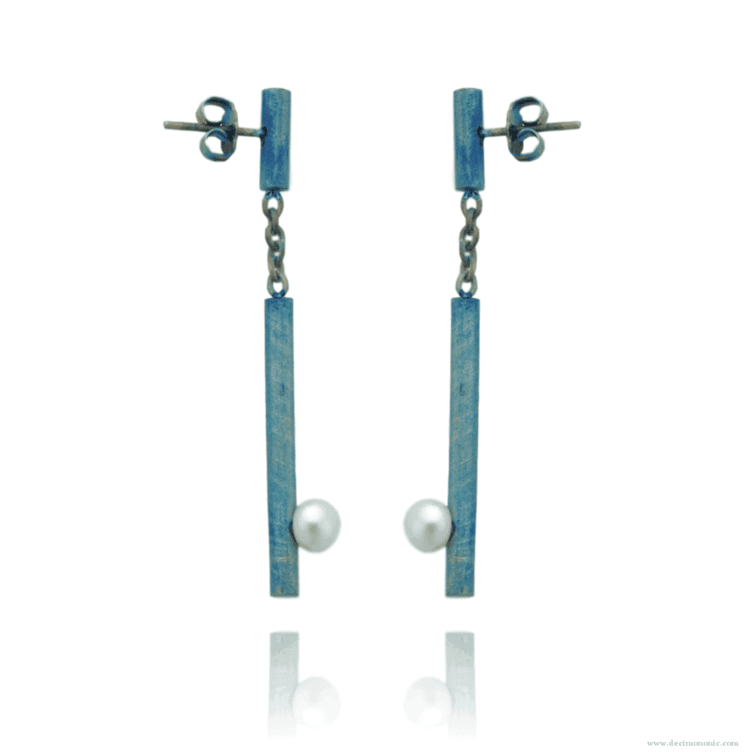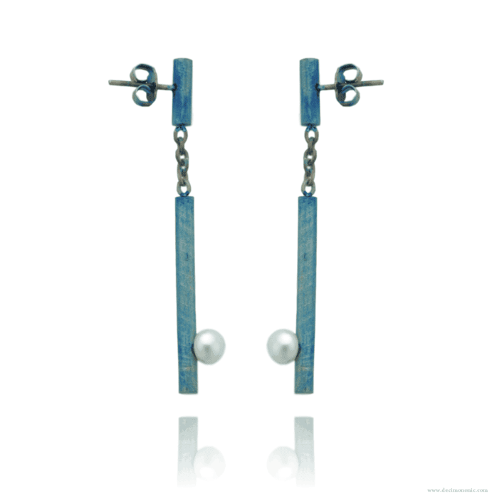 Handmade blue-colored titanium long bar earrings with chain, one freshwater cultured pearl and titanium ear nuts.