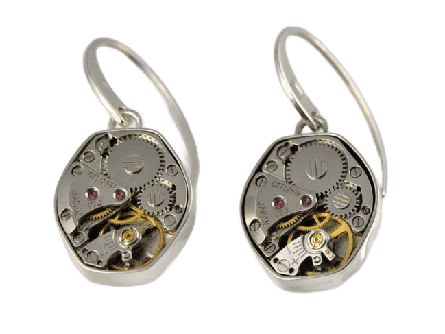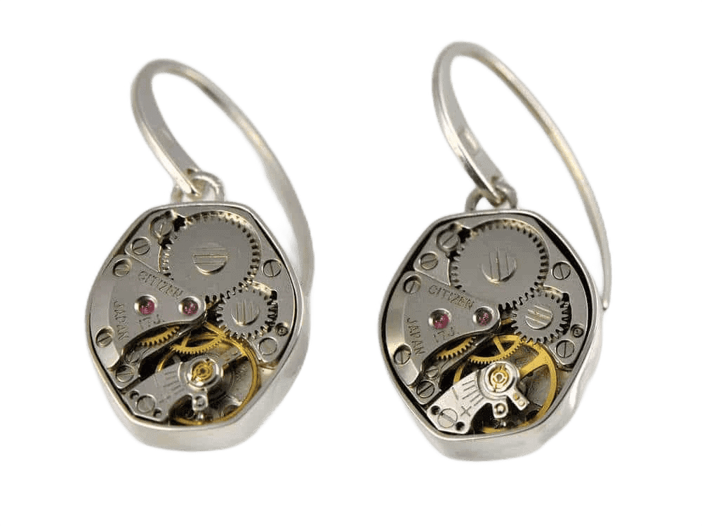 The ‘Machinarium Collection’ is a steampunk-inspired fine jewelry collection designed and created by Decimononic. Most of its pieces are made with sterling silver and have non-functional vintage or antique watch movements and/or gemstones.
