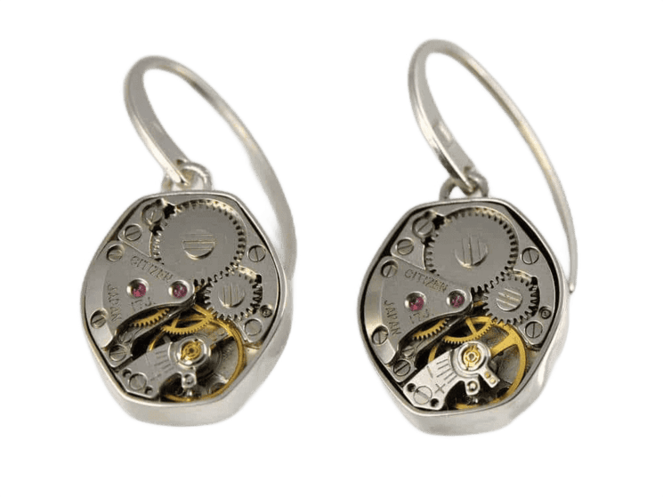 Sterling silver earrings with identical watch movements.