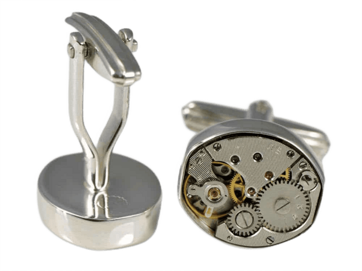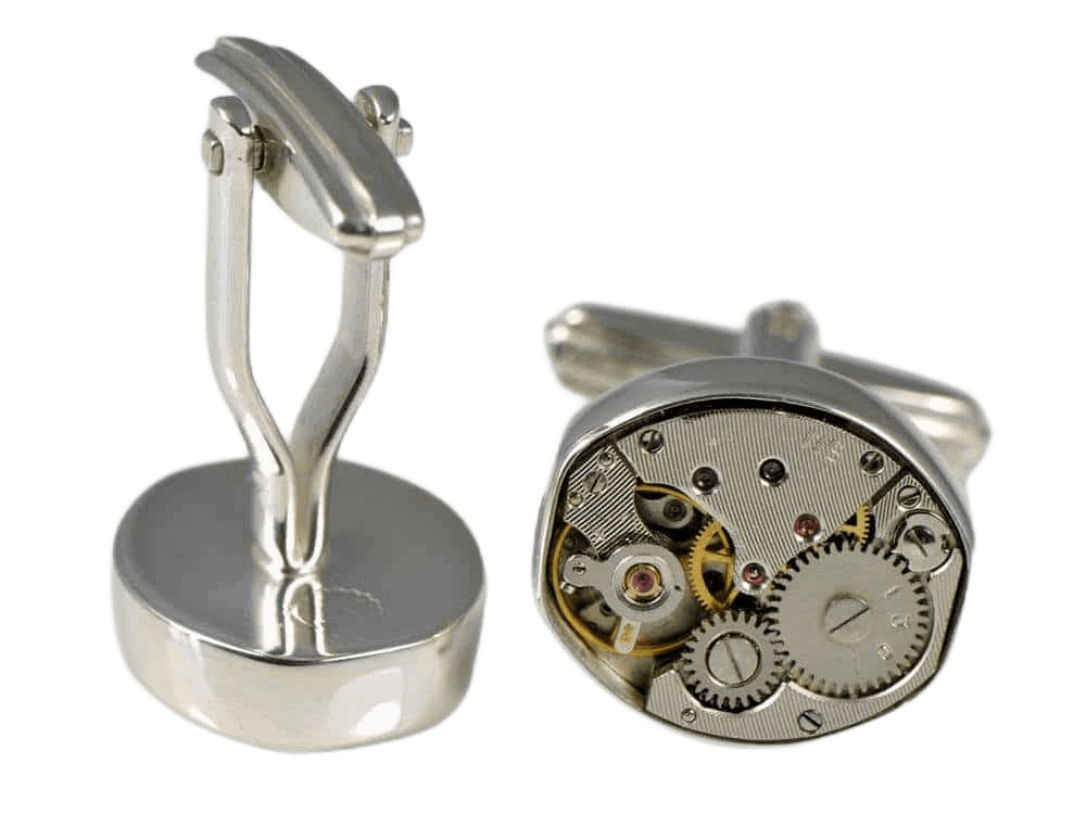 Sterling silver cufflinks with identical vintage watch movements. Matt finish.
