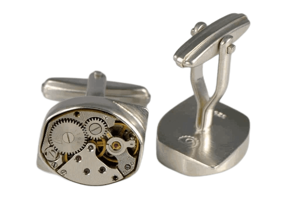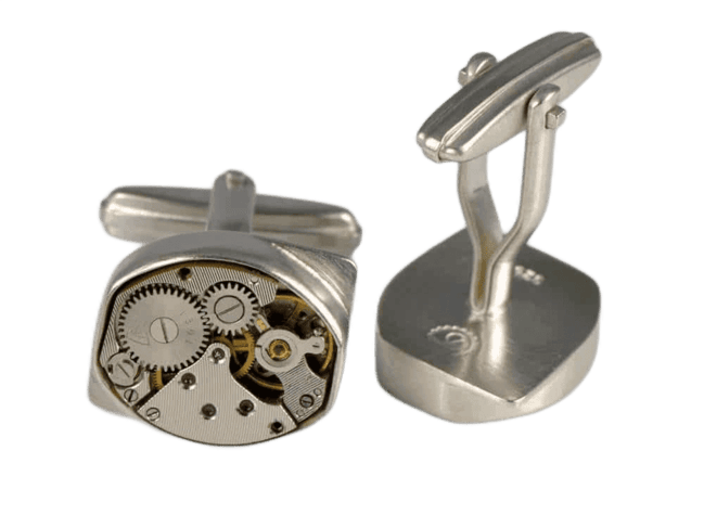Sterling silver cufflinks with identical vintage watch movements. Matt finish.