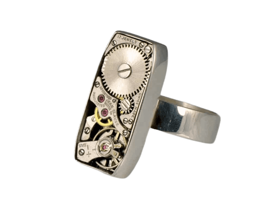 This elegant and sober ring shows an evident Steampunk influence. The rectangular shaped watch movement provides a balanced and classical look, really comfortable to wear.